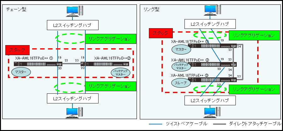 - XA-AML16TFPoE++ 3台をリング型でスタックします。(右側の構成例)