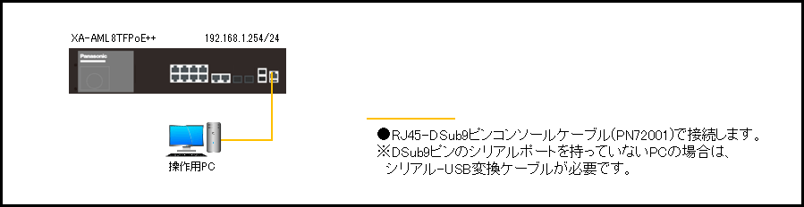 PCとスイッチングハブをコンソールケーブルで接続し、ZEQUO assist Plusなどのターミナルエミュレータにて設定画面を表示します。