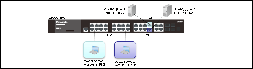 この設定例では、ZEQUO 2300/2310のMACベースVLAN設定について説明します。
