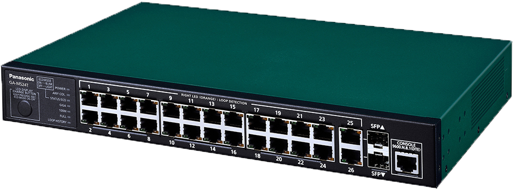 - 10/100/1000Mbps×26ポート + SFP×2スロット(10/100/1000Tポートと排他利用)