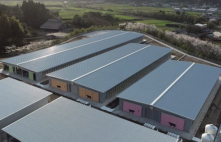 牛舎の壁面に給気用と排気用の換気扇を配置し、舎内温度・湿度・風速を均一に保ち、最適な飼養環境を実現