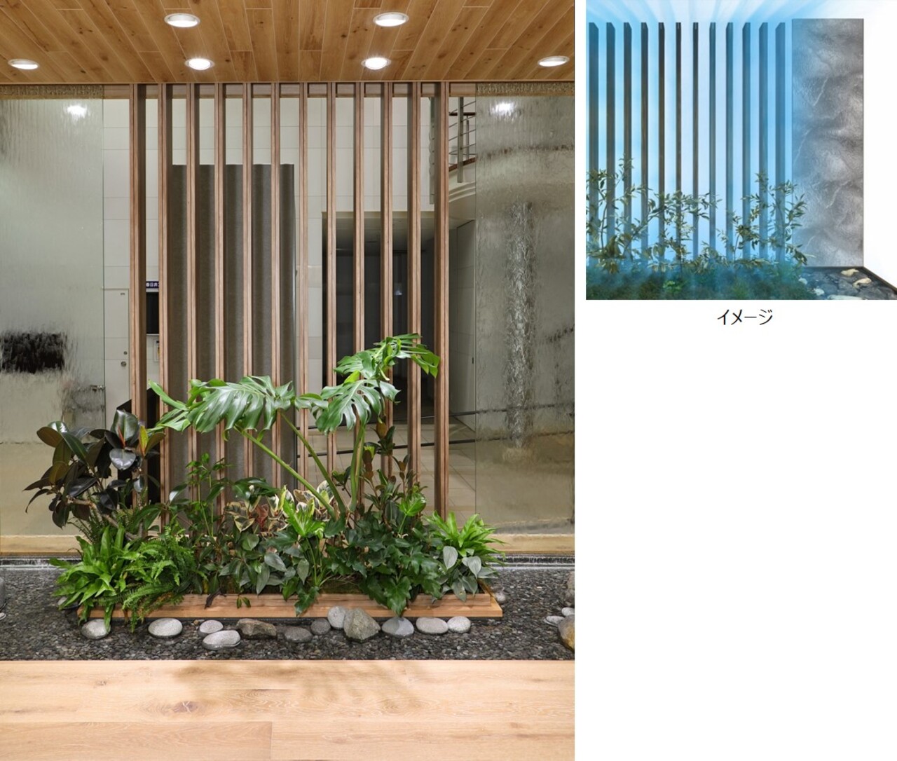 「空気をまとい、水を聞く」をコンセプトとし、複数の長いスリット状の吹き出し口から出る全身を包み込む滑らかでゆらぐ風と清潔な水の流れ、風で揺れる緑によりリラックスできる空間です。