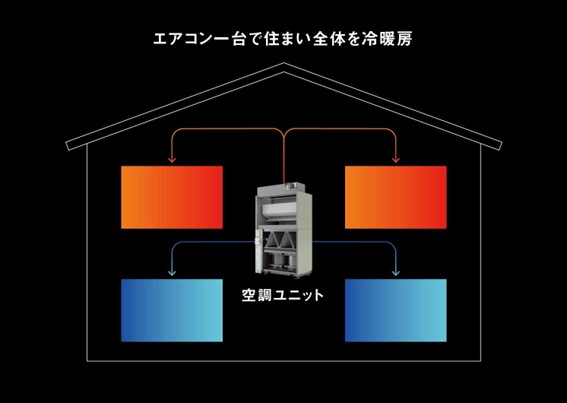 with airの仕組み。空調ユニット内に設置されたエアコン一台で、35坪から40坪ほどの2階建て住宅の居住空間を快適な温度に保つことができる