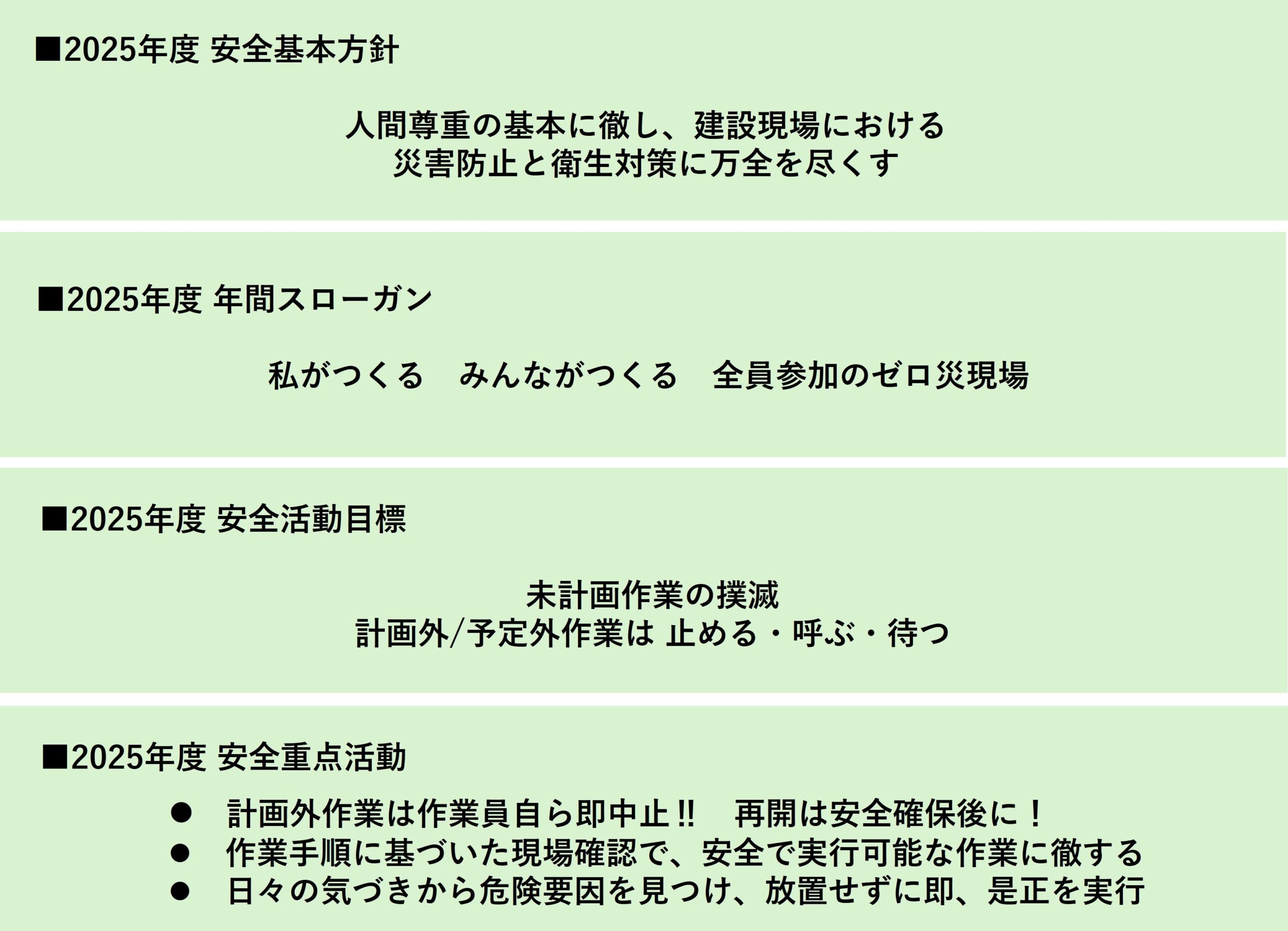 当社は今後も、社員および協力会社の皆様とともに安全意識のさらなる向上を図り、年間スローガンである「私がつくる みんながつくる 全員参加のゼロ災現場」 を胸に、災害のない明るく働きがいのある職場の実現を目指してまいります。