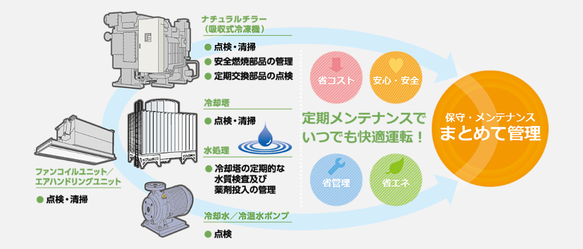 当社のメンテナンスでは、吸収式本体+付帯設備や冷却水の水処理などシステム全体をトータルで管理。