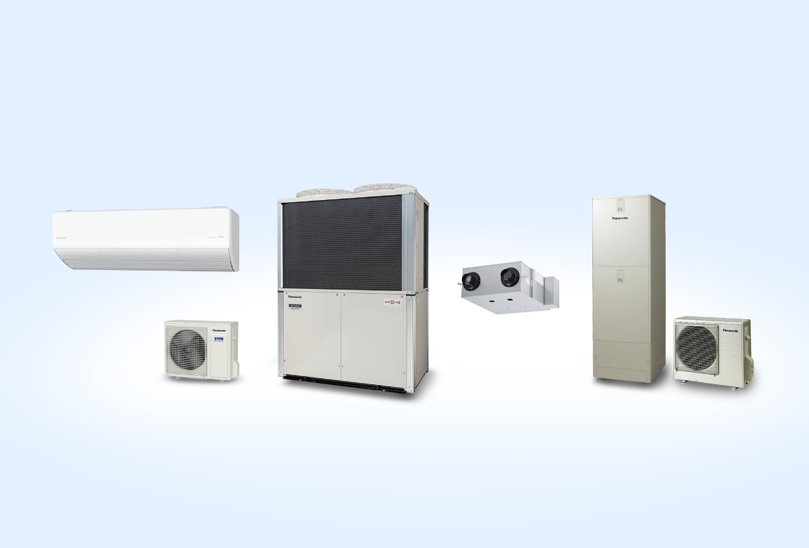 CO2削減に貢献する主な商品:(写真左から)ルームエアコン、ガスヒートポンプエアコン(GHP)、熱交換気ユニット、 ヒートポンプ給湯機