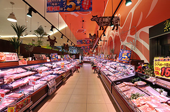 古賀店のコンセプトは「パズル」。食にかかわる人々やさまざまな要素をピースに例え、これらをつないでお客様に楽しんでもらえるお店をつくりたい、そんな想いを内装デザインに込めたそうです。アミューズメントパークのような店内ですが、手作りのパネルや趣向を凝らした陳列、きめ細かい演出などは、従業員のアイディアによるもの。商品のクオリティも非常に高く、特に生鮮品の鮮度では競合他社を圧倒しています。