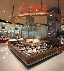 コンセプトは「マルシェ・プラス」。楽しさや賑わい、鮮度感といった市場のイメージに、簡便、即食、安心、憩いなどの価値を加えた売場づくりに挑戦しています。目玉となるのが鮮魚と精肉を円形に配置した売場で、中心に4面ガラス張りのブース「サニマ・キッチン」を設置し、従来のレシピ提案とは視点を変えた「時短」に役立つ半調理品を実演販売。EMSも導入し電力の「見える化」にも取り組んでいます。