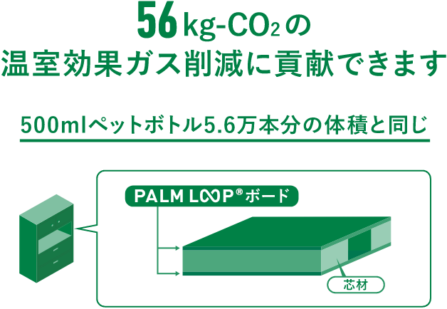 ※ボード1㎥当たりの温室効果ガス削減量:1.33t(SATREPS研究報告数値・2022年3月現在の製造条件を元に当社試算)