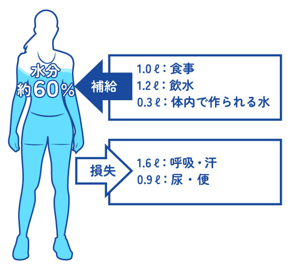 1日の生活活動で、約2.5Lの水分が失われていると言われ、尿や便で1.6L、汗や呼吸で0.9Lがカラダの外へ出ていきます。その為、体内代謝によって作られる水分0.3L以外に、食事からと飲み水で1.2~1.5Lを補給する必要があります。