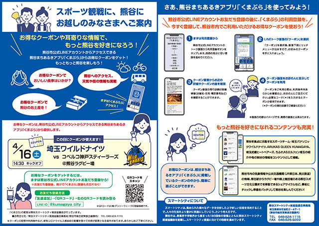 熊谷まちあるきアプリ「くまぶら」では、市内の様々なお店のお得なクーポン、気象情報、交通情報やスポーツ情報など、多彩なコンテンツを配信しています。